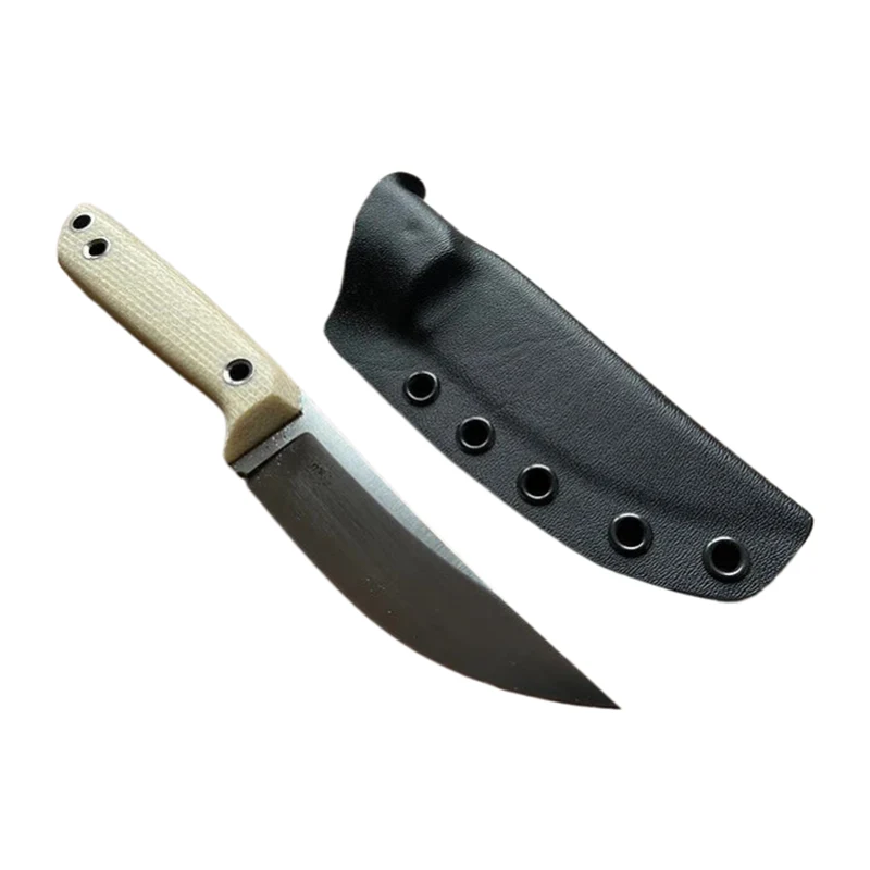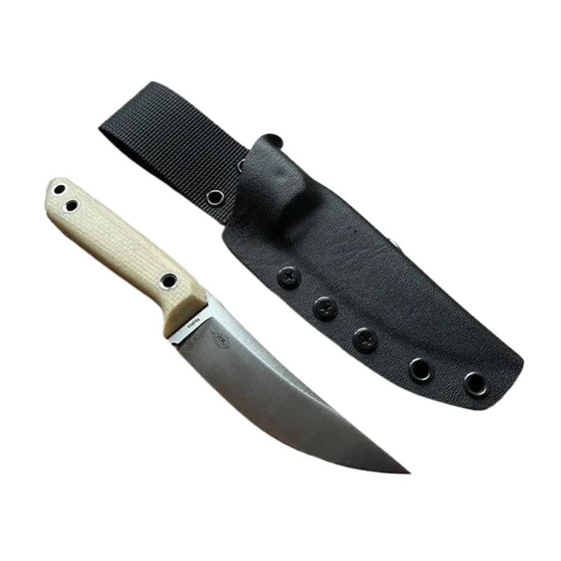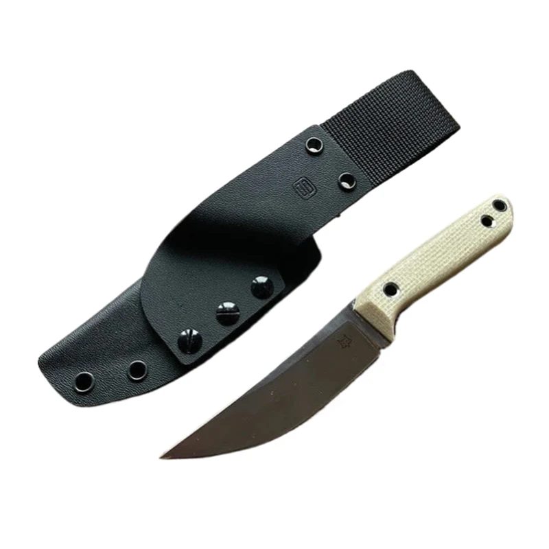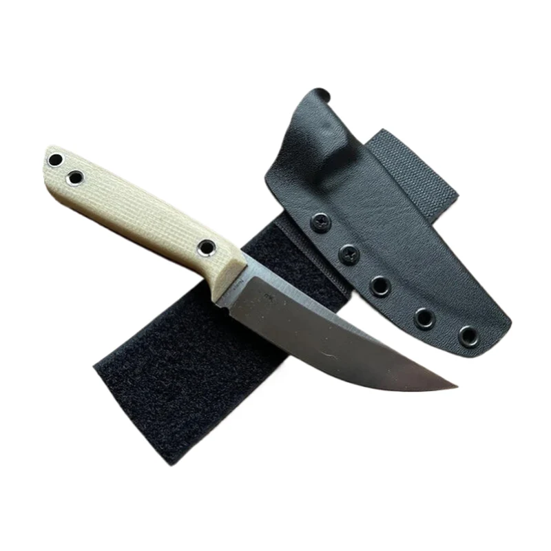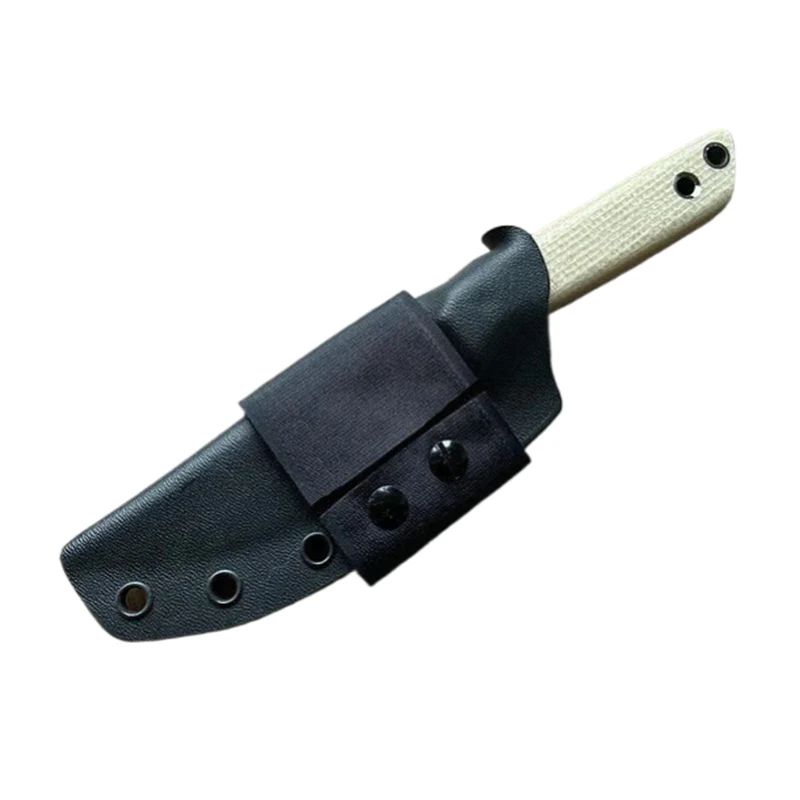 إذا كنت ترغب في حمل السكين إلى الأسفل قليلاً، فإنني أوصي بحزام من النايلون مع حامل Kydex. تعتبر حلقات الفيلكرو أو الحلقات الجلدية مثالية لحمل السكين عبر حزامك. يُعد الفيلكرو أيضًا حلاً عمليًا لربط السكين بحزام حقيبة ظهرك. بالإضافة إلى غمد Kydex، يمكنني إرفاق حامل من الفولاذ الناري، اختياريًا بفولاذ النار (بطول 80 مم).