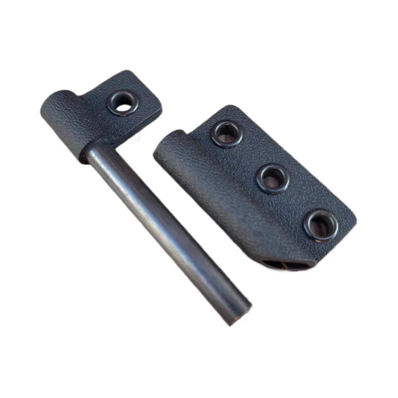يتوفر غمد السكين ذو القشرة الصلبة Kydex في ثقوب على جانب واحد وثقوب على كلا الجانبين. لربط السكين بالحزام بالطريقة الكلاسيكية، أفقيًا أو رأسيًا، عادةً ما يختار عملائي Multi-Lok. إذا كنت ترغب في حمل السكين إلى الأسفل قليلاً، فإنني أوصي بحزام من النايلون مع حامل Kydex. إذا كنت تريد حمل السكين أسفل الحزام بملحق صلب، فقد يكون Multi-Lok مع الامتداد شيئًا مناسبًا لك. تعتبر المشابك أو الفيلكرو مثالية لحمل السكين عبر الحزام. يُعد الفيلكرو أيضًا حلاً عمليًا لربط السكين بحزام حقيبة الظهر. بالإضافة إلى غمد Kydex، يمكنني إرفاق حامل من الفولاذ الناري، اختياريًا بفولاذ النار (بطول 80 مم).